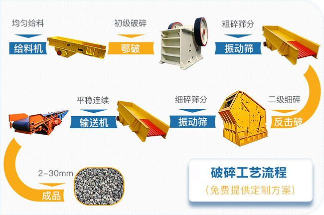 振動給料機GZD1100×4200,1臺;顎式破碎機PE750×1060,1臺;歐版反擊破PFW1214Ⅲ,2臺;圓振動篩4YZS2160,2臺。