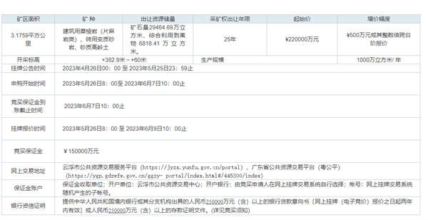 另外,采礦權(quán)出讓礦區(qū)面積3.1759平方公里(4763.84畝),礦區(qū)開(kāi)采范圍內(nèi)的土地以租賃方式使用。土地的租金、青苗補(bǔ)償款等費(fèi)用合計(jì)人民幣70000萬(wàn)元,由競(jìng)得人承擔(dān)并在簽訂《非油氣采礦權(quán)出讓合同》后,在2023年7月30日前支付第一期款項(xiàng)人民幣35000萬(wàn)元到云浮市云城區(qū)財(cái)政局指定銀行賬號(hào),第二期在2023年10月30日前繳納剩余款項(xiàng)人民幣35000萬(wàn)元。云浮市云城區(qū)人民政府負(fù)責(zé)協(xié)調(diào)完成礦區(qū)范圍(3.1759平方公里)租地后交由采礦權(quán)競(jìng)得人使用,具體租地情況由競(jìng)買申請(qǐng)人自行向云浮市云城區(qū)人民政府了解。